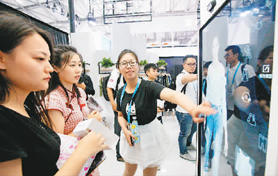在上海2017年亞洲消費(fèi)電子展上,參觀者在體驗(yàn)一款可與電商平臺網(wǎng)絡(luò)連接實(shí)現(xiàn)試穿下單一體化的智能穿衣鏡。新華社記者方喆攝