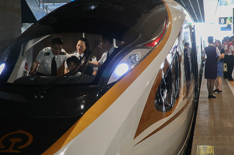 6月26日,在上海虹橋火車站,工作人員在“復(fù)興號(hào)”G124次列車駕駛艙內(nèi)進(jìn)行發(fā)車前的準(zhǔn)備。“復(fù)興號(hào)”是由中國(guó)鐵路總公司牽頭組織研制、具有完全自主知識(shí)產(chǎn)權(quán)、達(dá)到世界先進(jìn)水平的中國(guó)標(biāo)準(zhǔn)動(dòng)車組。