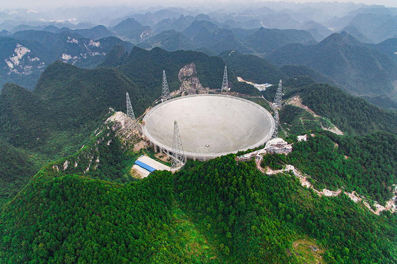 這是FAST工程全景(2016年9月7日攝)。2016年9月25日,有著“超級(jí)天眼”之稱的500米口徑球面射電望遠(yuǎn)鏡(FAST)在貴州平塘的喀斯特洼坑中落成啟用。