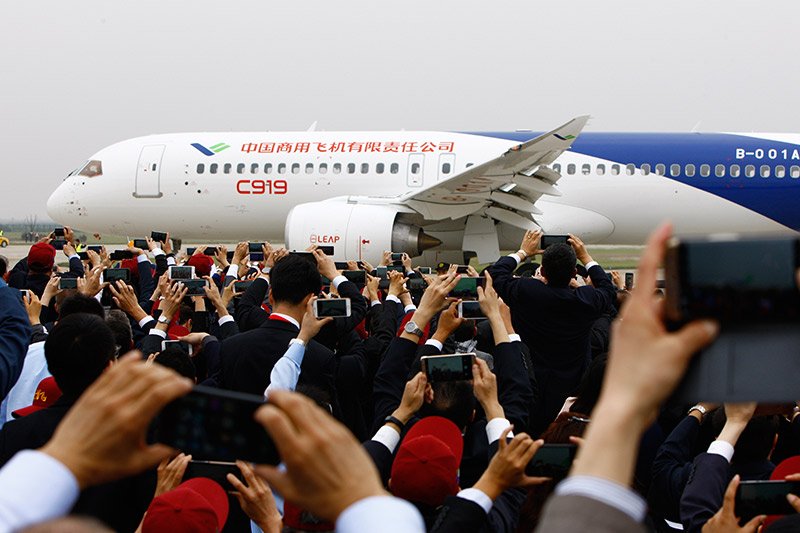 5月5日,中國(guó)首款國(guó)際主流水準(zhǔn)的干線客機(jī)C919在上海浦東國(guó)際機(jī)場(chǎng)首飛成功。
