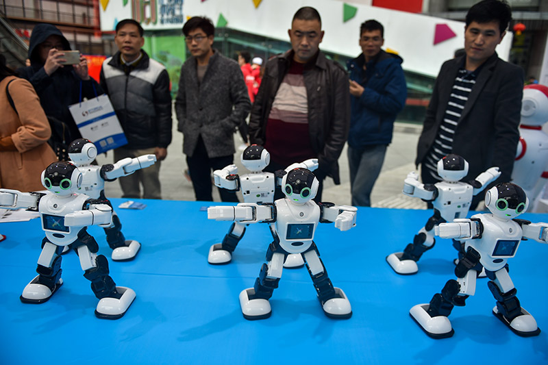 1月14日,市民在開(kāi)街后的深圳華強(qiáng)北觀看機(jī)器人表演。