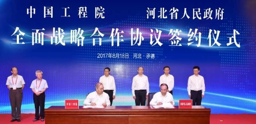 2017年8月18日上午,中國(guó)工程院與河北省人民政府在河北省承德市舉行了全面戰(zhàn)略合作簽約儀式。中國(guó)工程院黨組書(shū)記李曉紅、河北省省委副書(shū)記、省長(zhǎng)許勤、中國(guó)工程院副院長(zhǎng)劉旭、河北省人民政府副省長(zhǎng)張古江、河北省人民政府副省長(zhǎng)徐建培出席了會(huì)議。劉旭、徐建培代表院省雙方簽署了合作協(xié)議。河北省人民政府秘書(shū)長(zhǎng)朱浩文主持了簽約儀式。