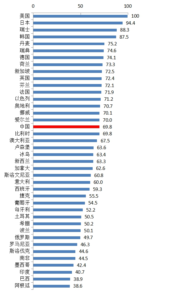“金磚五國”除中國外,排名均在30名之后。俄羅斯列第33位,處于第三集團中的領(lǐng)先位置;南非、印度和巴西在40國中仍處于靠后的位置,分列第36、第38和第39位。