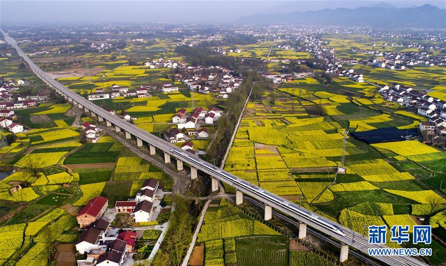 3月21日,一列動車正通過陜西省漢中市南鄭縣新集鎮(zhèn)油菜花海(無人機(jī)拍攝)。新華社記者陶明攝