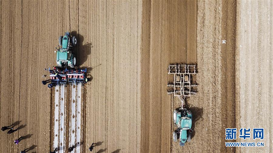 3月23日,“智能拖拉機(jī)”在新疆庫車縣牙哈鎮(zhèn)的一處棉田中進(jìn)行精細(xì)化作業(yè)(無人機(jī)拍攝)。新華社記者胡虎虎攝