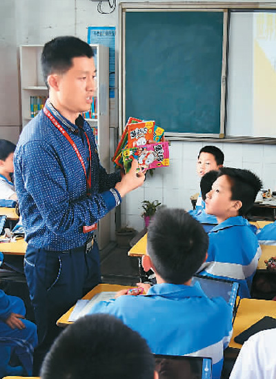4月23日,江西省新余市分宜縣的執(zhí)法人員在分宜縣小學向學生講解盜版書籍的鑒別方法。周亮攝(人民視覺)