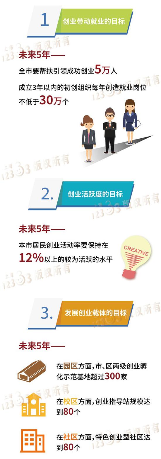 新一輪行動(dòng)計(jì)劃明確了三個(gè)維度的目標(biāo):一是創(chuàng)業(yè)帶動(dòng)就業(yè)的目標(biāo),提出未來五年全市要幫扶引領(lǐng)成功創(chuàng)業(yè)5萬人,成立三年以內(nèi)的初創(chuàng)組織每年創(chuàng)造就業(yè)崗位不低于30萬個(gè);二是創(chuàng)業(yè)活躍度的目標(biāo),提出上海居民創(chuàng)業(yè)活動(dòng)率要保持在12%以上的較為活躍水平;三是發(fā)展創(chuàng)業(yè)載體的目標(biāo)。在園區(qū)方面,市、區(qū)兩級創(chuàng)業(yè)孵化示范基地超300家;在校區(qū)方面,創(chuàng)業(yè)指導(dǎo)站規(guī)模達(dá)80個(gè);在社區(qū)方面,特色創(chuàng)業(yè)型社區(qū)達(dá)80個(gè)。