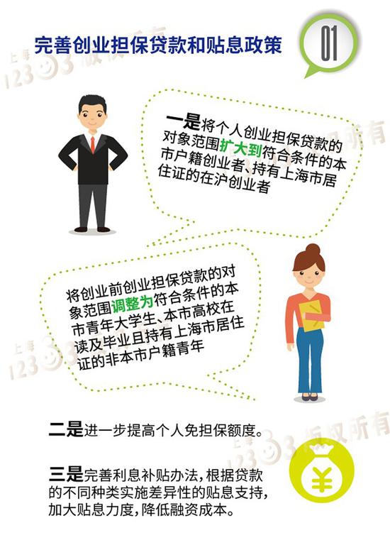 是完善創(chuàng)業(yè)擔(dān)保貸款和貼息政策。一是將個(gè)人創(chuàng)業(yè)擔(dān)保貸款的對象范圍擴(kuò)大到符合條件的本市戶籍創(chuàng)業(yè)者、持有上海市居住證的在滬創(chuàng)業(yè)者;將創(chuàng)業(yè)前創(chuàng)業(yè)擔(dān)保貸款的對象范圍調(diào)整為符合條件的本市青年大學(xué)生、本市高校在讀及畢業(yè)且持有上海市居住證的非本市戶籍青年。二是進(jìn)一步提高個(gè)人免擔(dān)保額度。三是完善利息補(bǔ)貼辦法,根據(jù)貸款的不同種類實(shí)施差異性的貼息支持,加大貼息力度,降低融資成本。