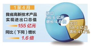 制圖/展茂光 本報(bào)訊(記者邢杰冉通訊員楊寶麗)據(jù)石家莊海關(guān)統(tǒng)計(jì),1至4月,我省高新技術(shù)產(chǎn)品實(shí)現(xiàn)進(jìn)出口總值155億元,同比(下同)增長(zhǎng)1.6倍。其中出口58.4億元,增長(zhǎng)41.7%;進(jìn)口96.6億元,增